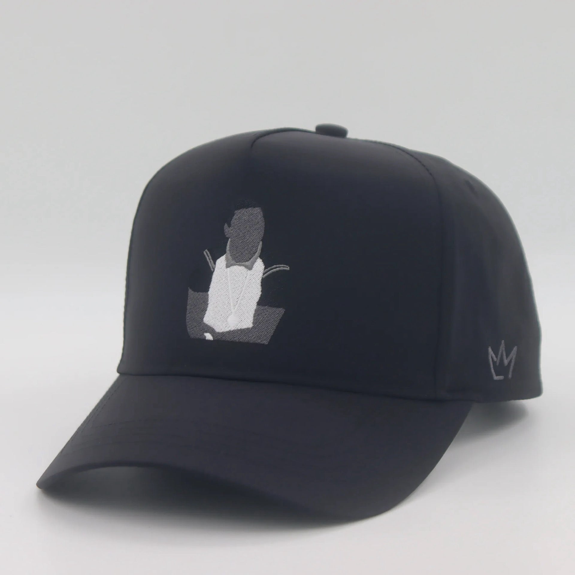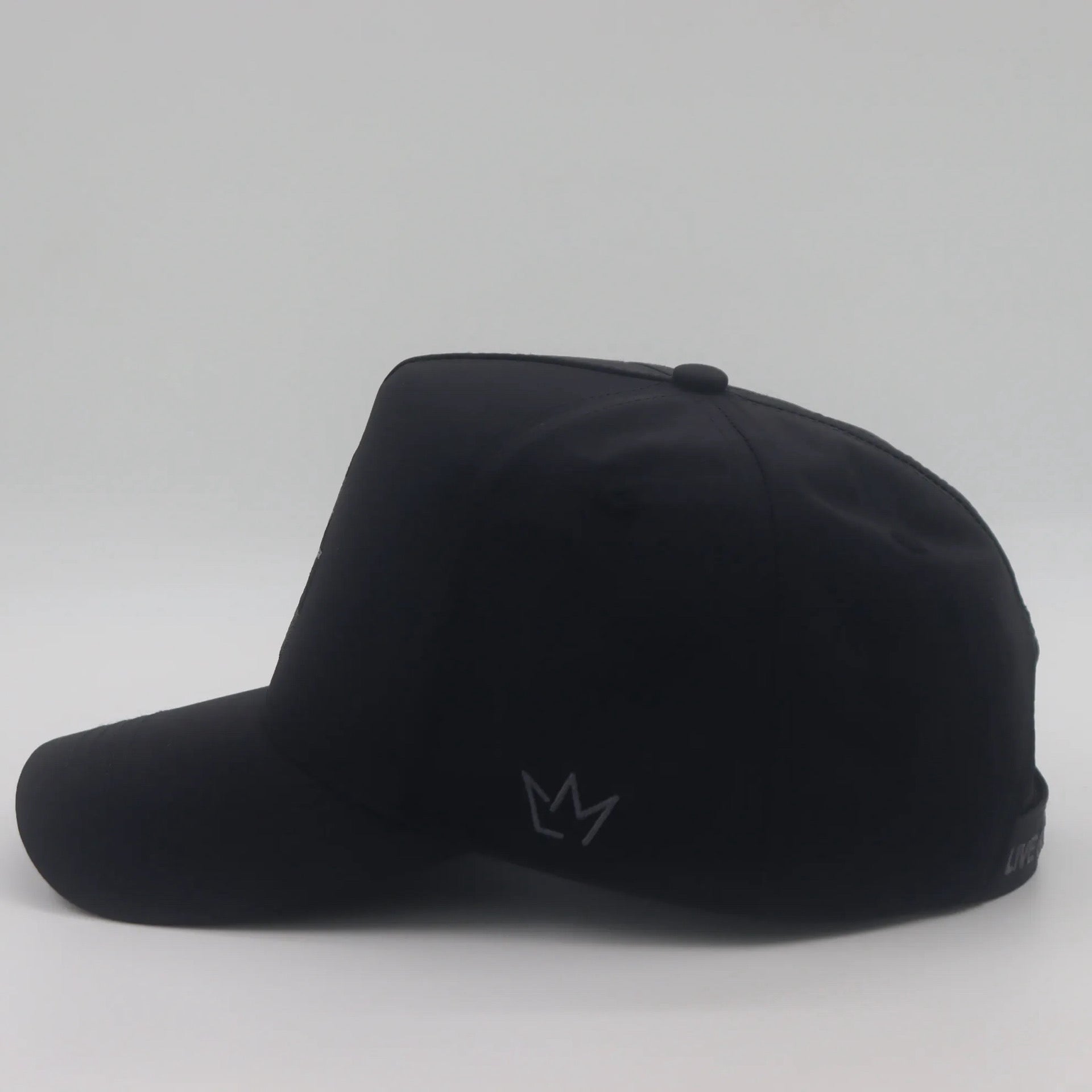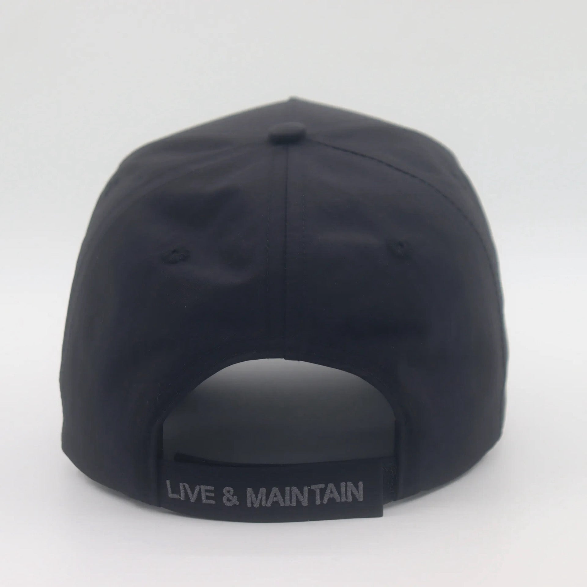 Nylon 5 panel cap with velcro closure. Embroided “Mitch” cartoon on the front with “Live&Maintain” on the velcro closure and crown logo on the side